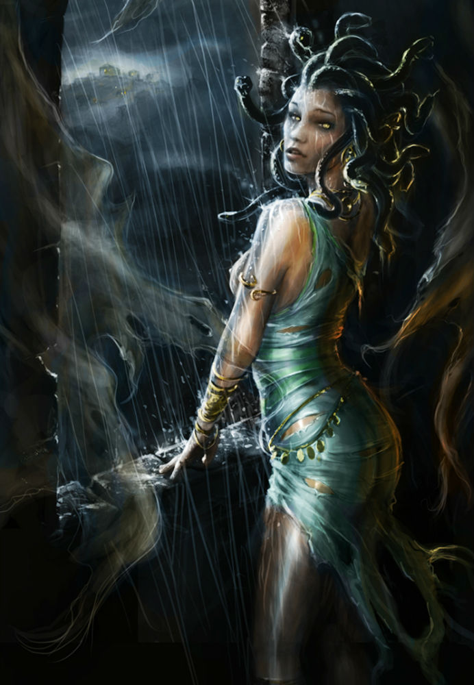 เมดูซ่าถือว่าเป็นอสูรกายที่ดูน่าสงสารตนหนึ่ง ก่อนหน้าที่เธอจะเป็นเมดูซ่าหัวงูน่ากลัวอย่างที่ทุกคนรู้จัก เธอมีหน้าตางดงามมาก่อน เป็นที่หมายปองของชายมากมาย จวนแล้ววันนึ่งที่เธอไปสักการะที่เทือกเขาเทพีอาเธน่าเธอได้พบกับเพโพไซดอน ด้วยหน้าตางดงามของเธอจึงทำให้เทพโพไซดอนหลงรักเข้าอย่างจัง โพไซดอนต้องการเมดูซ่ามาครอบครองจึงใช้กำลังข่มขืนเธอที่วิหารอาเธน่า เมื่ออาเธน่ารู้จึงใส่ความเธอว่าเมดูซ่า ดูหมิ่นและลบลู่เธอในวิหารศักดิ์สิทธิ์ อาเธน่าสาปให้เมดูซ่ามีหน้าตาหน้ากลัว ตามตัวมีเกล็ดงูและผมของเธอที่เคยสวยงามกลายเป็นผมที่มีงู